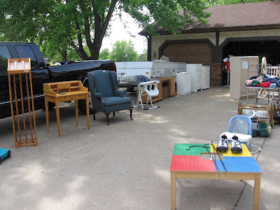 Last weekend we had a garage sale to help out with our adoption expenses. We told our family and close friends that if they had any stuff they were gonna get rid of anyway, we'd take it off their hands. Everyone really came through more than we ever could have expected. They did the same thing last year and it's been so nice to have such great support from everyone. The sale wasn't as busy as I'd like to have had it and Saturday was a total bust. We got rained out in the morning and couldn't be open in the afternoon because of Jason playing at the Springfest...but for those 2 days, we made about $900 so we are very happy about that. Hey, that's a lot of quarter stuff. The boys even sold hot dogs, chips, fruit snacks, and pop to help the cause.